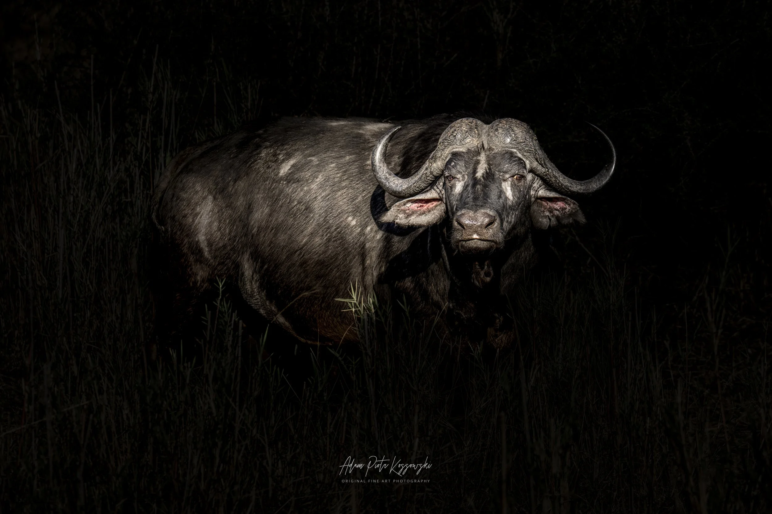 The evening air carried the weight of stillness. Shadows stretched long across the grasslands as the last light of day faded into a hushed glow. In that silence, he stood. Stock still. A dark wall of muscle and horn, eyes fixed on us with a gaze that seemed to pin the earth in place.