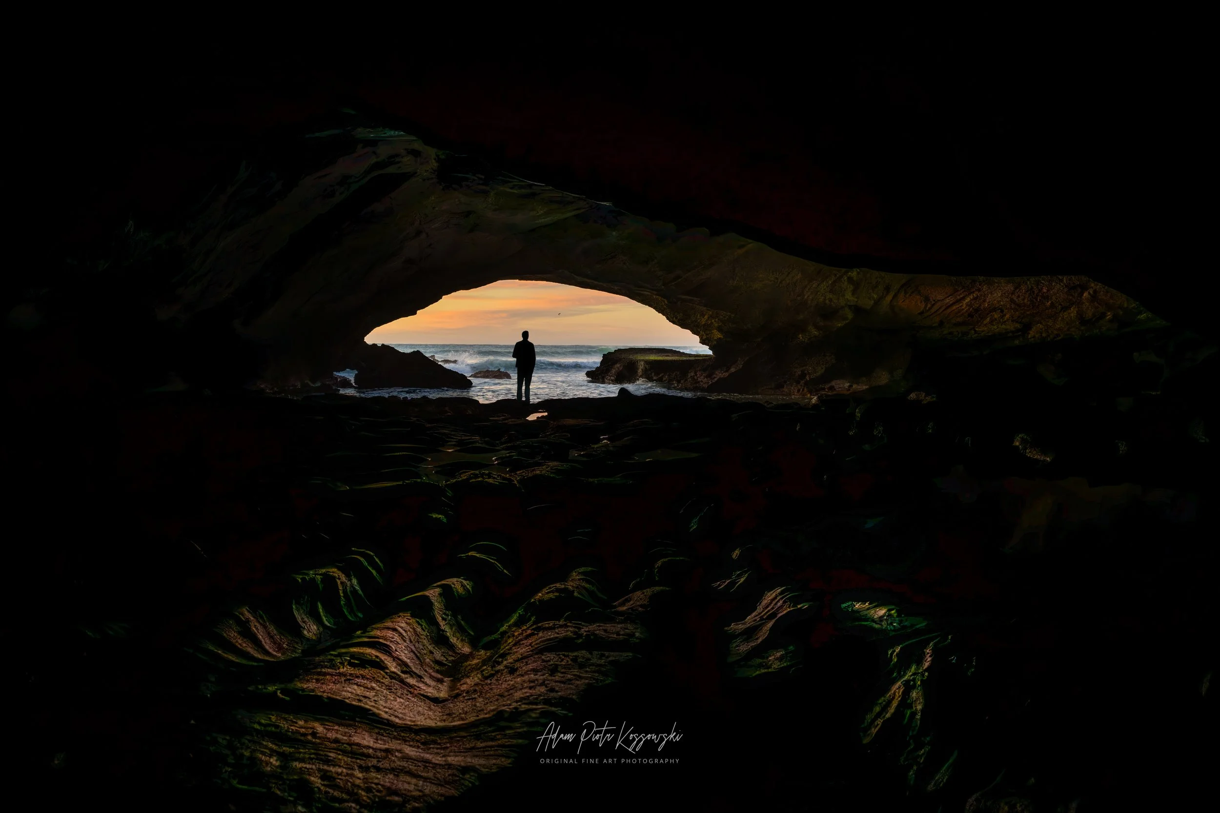 At dawn, in the stillness of Waenhuiskrans, perspective sharpens. A great, hollow arch frames the horizon, the sky softening from indigo into molten amber. And there, at the mouth of the cave, stands a man. His figure is small against the opening, dwarfed by rock and sea, yet the moment feels full — as if both man and cavern are suspended in a single breath.